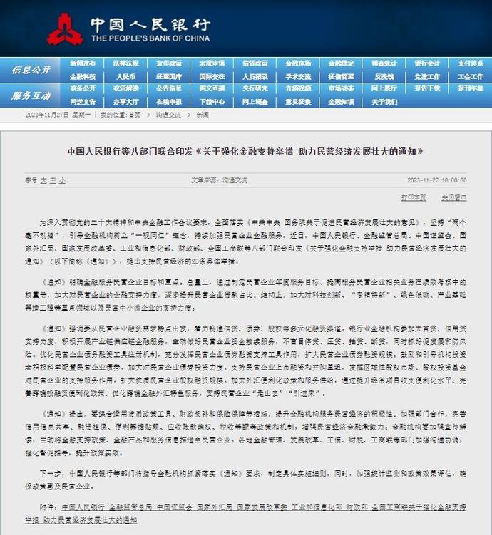 为深入贯彻党的二十大精神和中央金融工作会议要求,全面落实《中共中央 国务院关于促进民营经济发展壮大的意见》,坚持“两个毫不动摇”,引导金融机构树立“一视同仁”理念,持续加强民营企业金融服务,近日,中国人民银行、金融监管总局、中国证监会、国家外汇局、国家发展改革委、工业和信息化部、财政部、全国工商联等八部门联合印发《关于强化金融支持举措 助力民营经济发展壮大的通知》(以下简称《通知》),提出支持民营经济的25条具体举措。