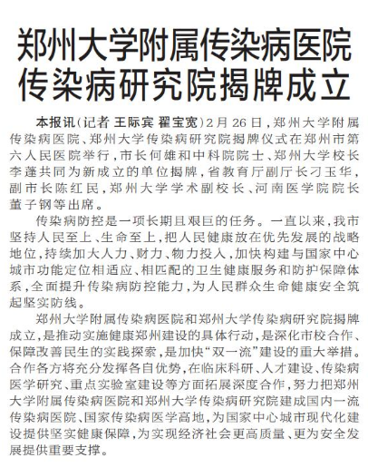2月26日,郑州大学附属传染病医院、郑州大学传染病研究院揭牌仪式在郑州市第六人民医院举行,市长何雄和中科院院士、郑州大学校长李蓬共同为新成立的单位揭牌,省教育厅副厅长刁玉华,副市长陈红民,郑州大学学术副校长、河南医学院院长董子钢等出席。(今日《郑州日报》1版)