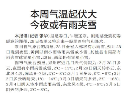 最是春日,乍暖还寒。刚刚感受到初春暖意的郑州,28日夜里又将迎来一股弱冷空气和降水。(今日《郑州日报》1版)