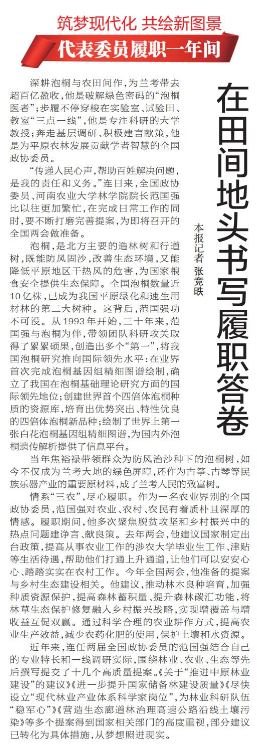 深耕泡桐与农田间作,为兰考带去超百亿盈收,他是破解绿色密码的“泡桐医者”;步履不停穿梭在实验室、试验田、教室“三点一线”,他是专注科研的大学教授;奔走基层调研、积极建言献策,他是为平原农林发展贡献学者智慧的全国政协委员。(今日《郑州日报》2版)