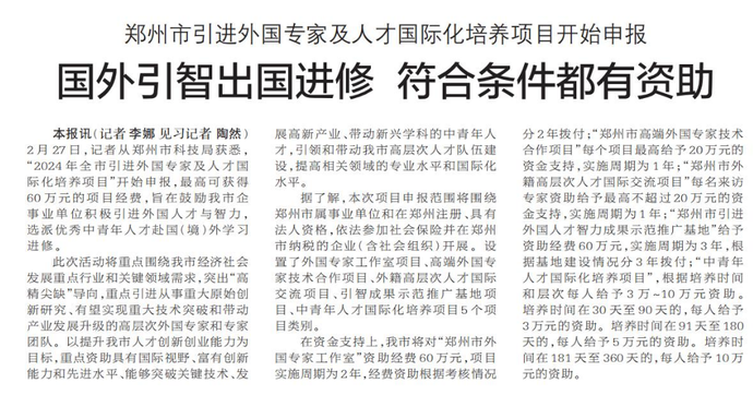 2月27日,记者从郑州市科技局获悉,“2024年全市引进外国专家及人才国际化培养项目”开始申报,最高可获得60万元的项目经费,旨在鼓励我市企事业单位积极引进外国人才与智力,选派优秀中青年人才赴国(境)外学习进修。(今日《郑州日报》2版)