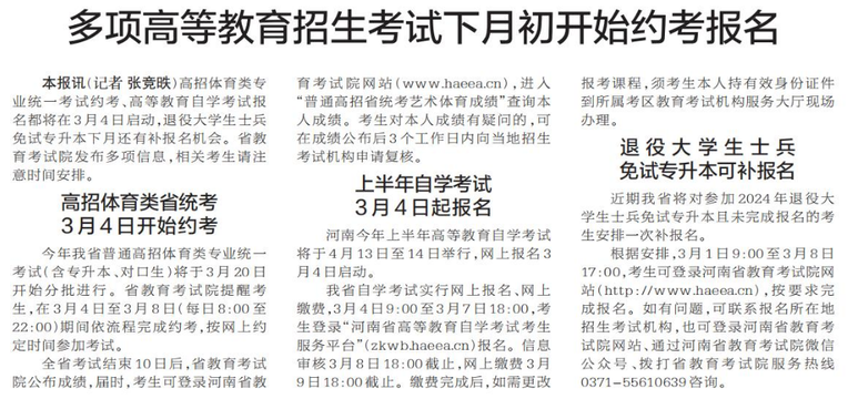 高招体育类专业统一考试约考、高等教育自学考试报名都将在3月4日启动,退役大学生士兵免试专升本下月还有补报名机会。省教育考试院发布多项信息,相关考生请注意时间安排。(今日《郑州日报》2版)