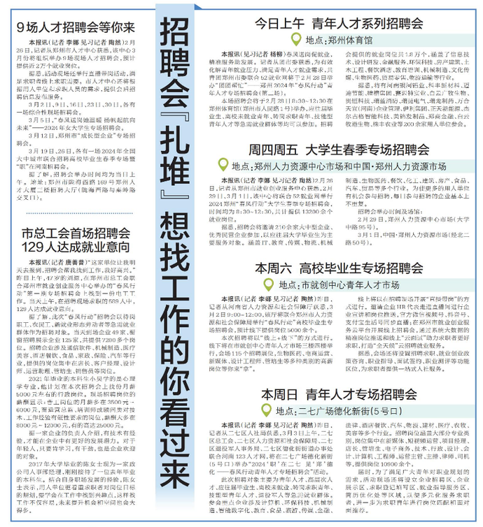 2月26日,记者从郑州市就业创业服务中心获悉,2月29日、3月1日,该中心将联合52就业网举行2024郑州“春风行动”大学生春季专场招聘会,时间均为8:30~12:30,共计提供13200余个就业岗位。(今日《郑州日报》5版)