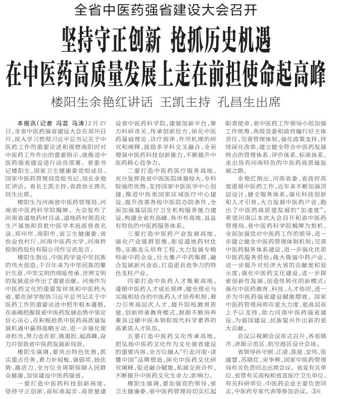 2月27日,全省中医药强省建设大会在郑州召开,深入学习贯彻习近平总书记关于中医药工作的重要论述和视察南阳时对中医药工作作出的重要指示,就推进中医药强省建设进行动员部署。省委书记楼阳生,国家卫生健康委党组成员、国家中医药管理局党组书记、局长余艳红讲话。省长王凯主持,省政协主席孔昌生出席。(今日《河南日报》1版)