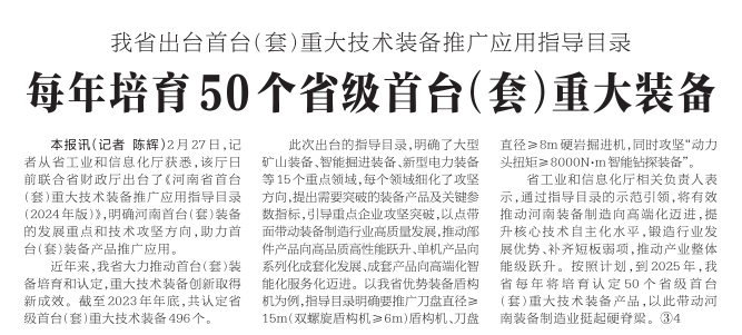 2月27日,记者从省工业和信息化厅获悉,该厅日前联合省财政厅出台了《河南省首台(套)重大技术装备推广应用指导目录(2024年版)》,明确河南首台(套)装备的发展重点和技术攻坚方向,助力首台(套)装备产品推广应用。(今日《河南日报》1版)