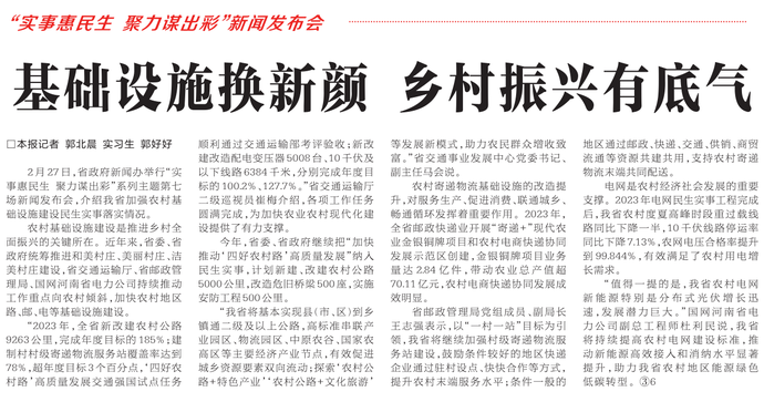 2月27日,省政府新闻办举行“实事惠民生 聚力谋出彩”系列主题第七场新闻发布会,介绍我省加强农村基础设施建设民生实事落实情况。