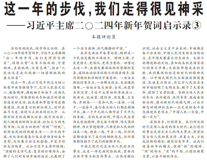 历经风雨洗礼,阔步伟大征程。在二〇二四年新年贺词中,习近平主席强调“这一年的步伐,我们走得很见神采”,深情点赞“大家不惧风雨、守望相助,直面挑战、攻坚克难”,指出“人民永远是我们战胜一切困难挑战的最大依靠”。(今日《人民日报》1版)