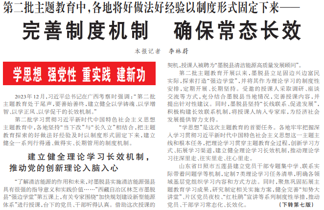 2023年12月,习近平总书记在广西考察时强调:“第二批主题教育处于尾声,要善始善终,建立健全以学铸魂、以学增智、以学正风、以学促干的长效机制。”