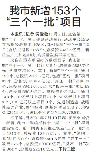 1月2日,全省第十一期“三个一批”项目建设活动举行,其中郑州新增“三个一批”项目(含航空港区)153个、总投资2332.5亿元,跑出项目建设“加速度”。(今日《河南日报》2版)