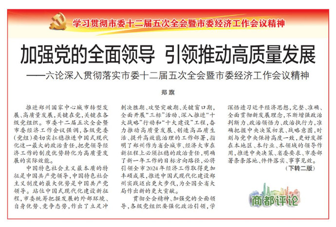 推进郑州国家中心城市转型发展、高质量发展,关键在党,关键在各级党组织。市委十二届五次全会暨市委经济工作会议强调,各级党委(党组)要切实扛稳推进中国式现代化这一最大的政治责任,把党领导经济工作的制度优势转化为高质量发展的实际效能。(今日《郑州日报》1版、2版)