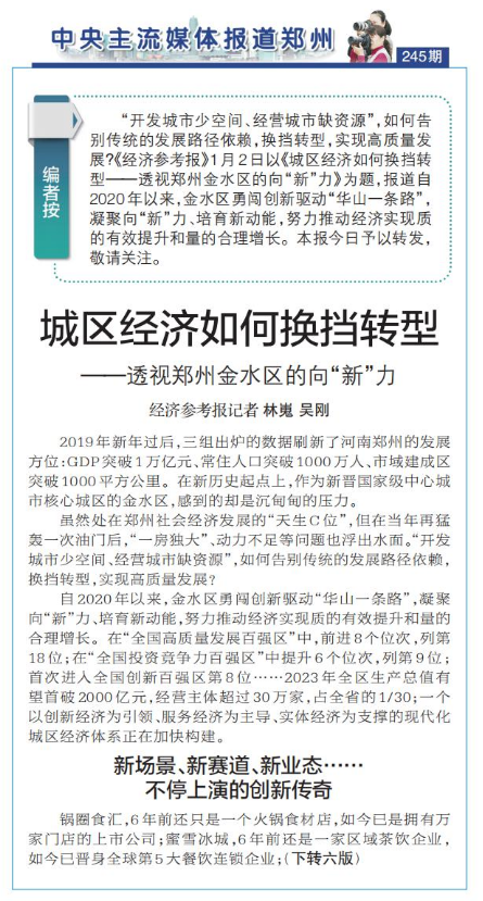“开发城市少空间、经营城市缺资源”,如何告别传统的发展路径依赖,换挡转型,实现高质量发展?《经济参考报》1月2日以《城区经济如何换挡转型——透视郑州金水区的向“新”力》为题,报道自2020年以来,金水区勇闯创新驱动“华山一条路”,凝聚向“新”力、培育新动能,努力推动经济实现质的有效提升和量的合理增长。本报今日予以转发,敬请关注。