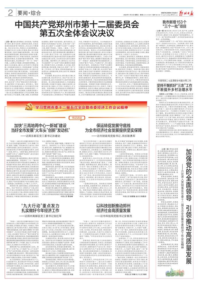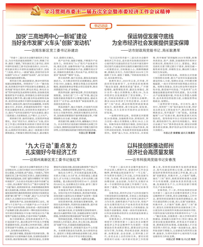 “市委十二届五次全会暨市委经济工作会议导航定向,让我们对做好2024年的经济工作信心更强、方向更准、底气更足、干劲更大。”郑州高新区党工委书记张红军表示,高新区将锚定“聚焦高质量发展,实现‘量的合理增长’和‘质的有效提升’,为全省全市发展大局多作贡献”这一目标,突出聚焦“项目为王”“数字化转型”和“五链”融合,抢抓国家和省、市新部署新政策等重大发展机遇,河南省、郑州市支持开发区高质量发展政策机遇和抢抓国家支持地方发展资金政策“窗口期”等“三个机遇”,通过“九大行动”重点发力,扎实做好2024年经济工作。(今日《郑州日报》2版)