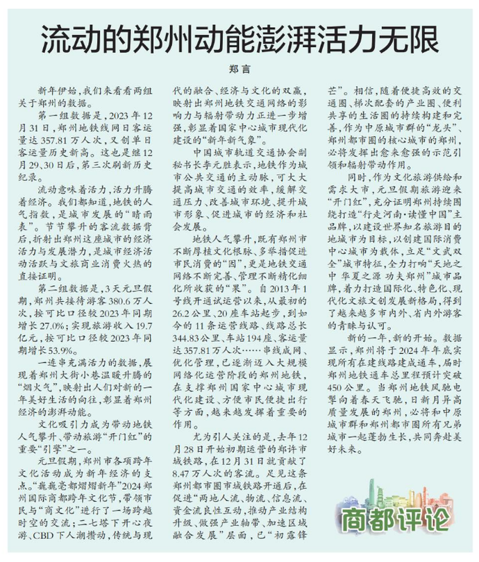 第一组数据是,2023年12月31日,郑州地铁线网日客运量达357.81万人次,又创单日客运量历史新高。这也是继12月29、30日后,第三次刷新历史纪录。(今日《郑州日报》3版)