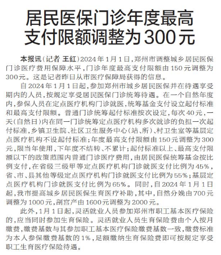 2024年1月1日,郑州市调整城乡居民医保门诊医疗费用保障水平,门诊年度最高支付限额由150元调整为300元。这是记者昨日从市医疗保障局获得的信息。(今日《郑州日报》3版)