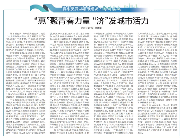 城市要发展,青年首先要发展。党的二十大报告深刻指出,全党要把青年工作作为战略性工作来抓。近年来,惠济区始终以习近平总书记关于青年工作的重要思想为指引,紧盯建设青年发展型城市目标,突出政策集成,聚力资源整合,推动“大美惠济”与“有为青年”双向奔赴、共同成长。(今日《郑州日报》3版)