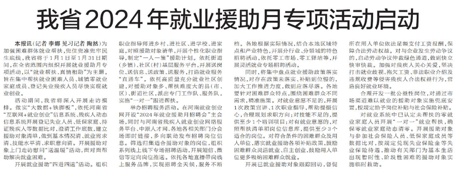 为加强困难群体就业帮扶,兜住兜准兜牢民生底线,我省将于1月1日至1月31日期间,在全省范围内组织开展就业援助月专项活动,以“就业帮扶、真情相助”为主题,旨在集中帮扶就业困难人员、城镇零就业家庭成员、登记失业残疾人员尽快实现就业创业。(今日《郑州日报》5版)