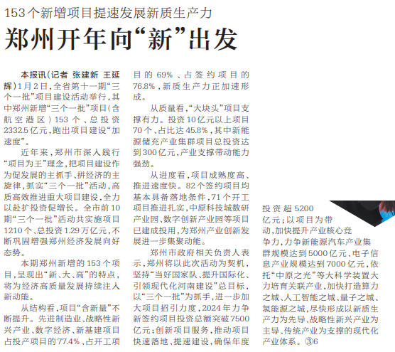 1月2日,全省第十一期“三个一批”项目建设活动举行,活动主会场设在郑州经济技术开发区,郑州新增“三个一批”项目(含航空港区)153个、总投资2332.5亿元。新质生产力加速形成,高质量发展再添动能。(今日《郑州日报》1版、2版)