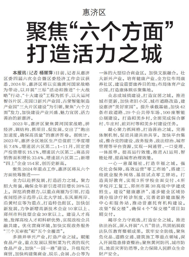 日前,记者从惠济区委四届六次全会暨区委经济工作会议获悉,2024年,惠济区将以实施黄河国家战略为带动,以开展“三标”活动和推进“十大战略”行动、“十大建设”工程为抓手,以大运河智谷片区、花园口新兴产业园、古荥智能制造产业园“三大片区建设”为引领,聚焦“六个方面”发力,加快建设产业兴盛、魅力宜居、活力善治的新惠济。(今日《郑州日报》7版)