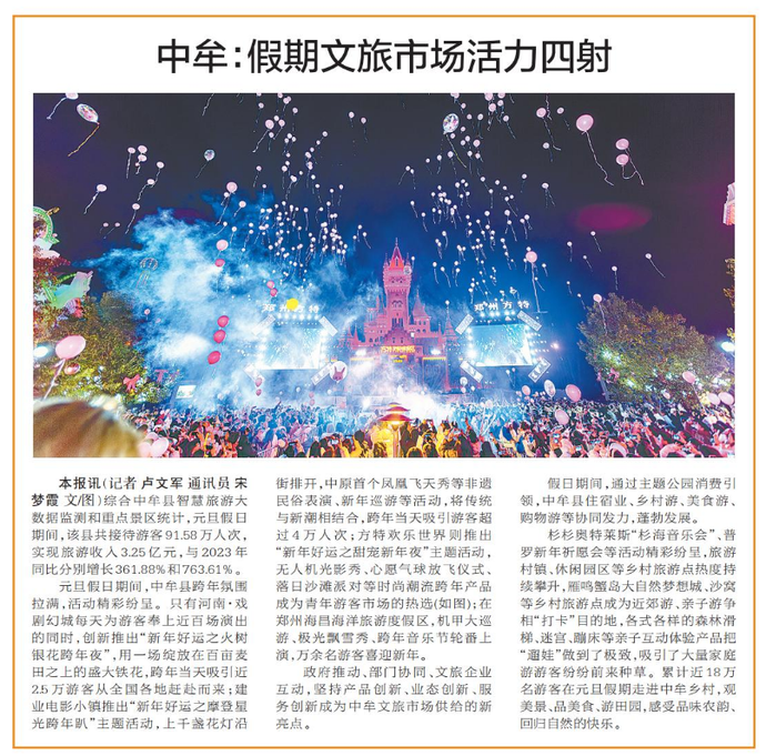 综合中牟县智慧旅游大数据监测和重点景区统计,元旦假日期间,该县共接待游客91.58万人次,实现旅游收入3.25亿元,与2023年同比分别增长361.88%和763.61%。(今日《郑州日报》7版)