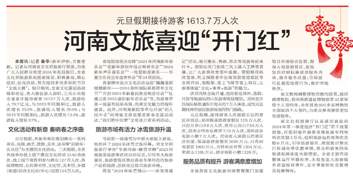 新年伊始,万象更新。记者从河南省文化和旅游厅获悉,为使广大人民群众欢度2024年元旦假日,全省文化和旅游系统提前谋划、积极备战,精心组织、优化供给,努力提供多元多彩的节日“文旅大餐”。假日期间,全省文化惠民活动精彩纷呈,各大景区游人如织,三天小长假全省累计接待游客1613.7万人次,旅游收入78.7亿元,与2023年同期相比,旅游人次增长23.3%,旅游收入增长28.9%;与2019年同期相比,旅游人次增长13.4%,旅游收入增长9.7%。(今日《郑州日报》8版)