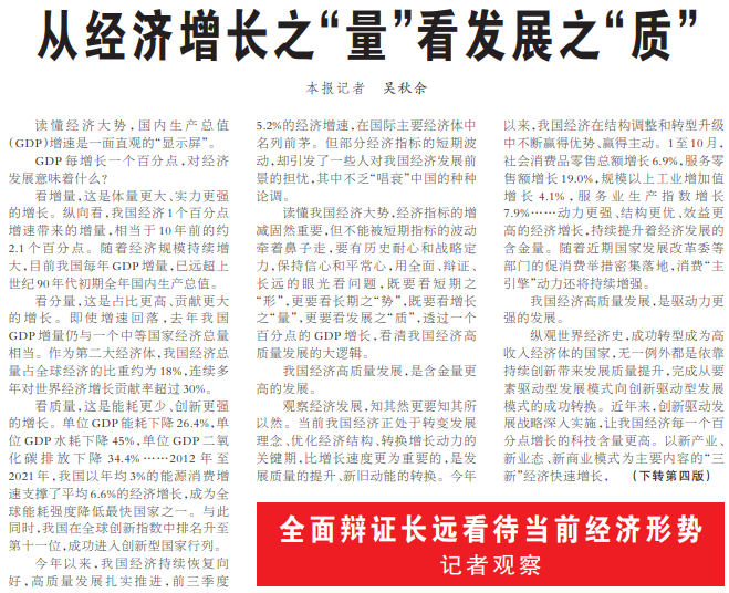 看增量,这是体量更大、实力更强的增长。纵向看,我国经济1个百分点增速带来的增量,相当于10年前的约2.1个百分点。随着经济规模持续增大,目前我国每年GDP增量,已远超上世纪90年代初期全年国内生产总值。(今日《人民日报》1版、4版)