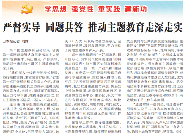 第二批主题教育启动以来,省委第一巡回督导组认真贯彻落实中央部署和省委要求,突出重点、严督实导,推动郑州市和航空港区主题教育向纵深开展。(今日《河南日报》1版)