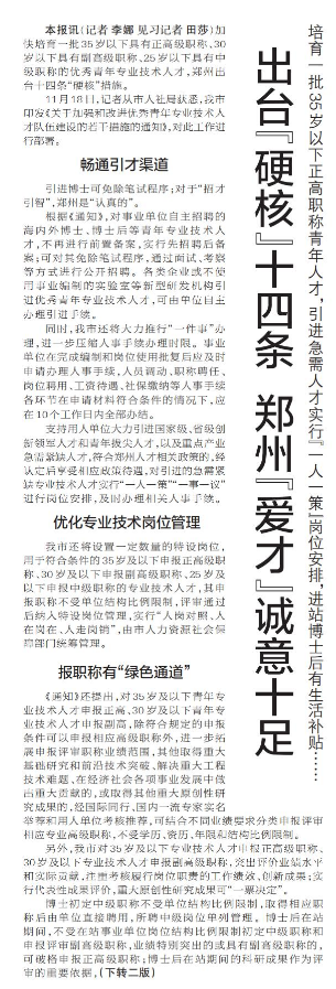 加快培育一批35岁以下具有正高级职称、30岁以下具有副高级职称、25岁以下具有中级职称的优秀青年专业技术人才,郑州出台十四条“硬核”措施。(今日《郑州日报》1版、2版)