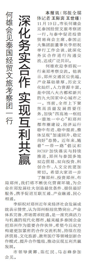 11月19日,市长何雄会见泰国经贸文旅考察团一行,与泰中促进投资贸易商会主席、泰国正大集团副董事长李绍祝举行工作会谈,就深化务实合作进行沟通交流、达成广泛共识。(今日《郑州日报》1版)
