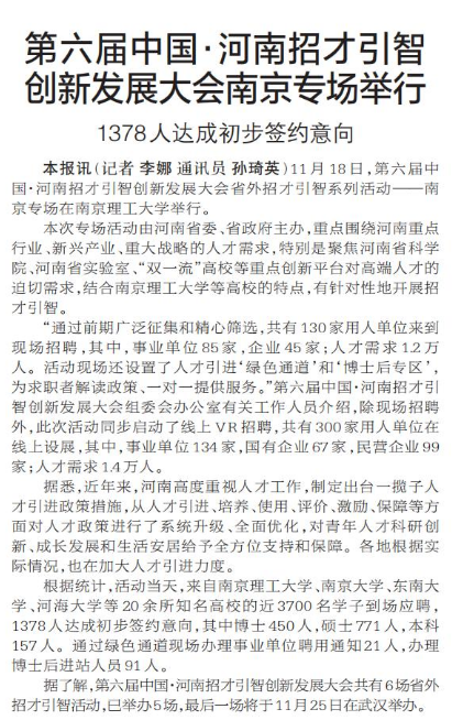 11月18日,第六届中国·河南招才引智创新发展大会省外招才引智系列活动——南京专场在南京理工大学举行。(今日《郑州日报》2版)