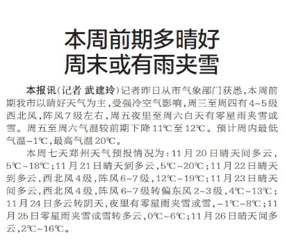 记者昨日从市气象部门获悉,本周前期我市以晴好天气为主,受强冷空气影响,周三至周四有4~5级西北风,阵风7级左右,周五夜里至周六白天有零星雨夹雪或雪。周五至周六气温较前期下降11℃至12℃。预计周内最低气温-1℃,最高气温20℃。(今日《郑州日报》2版)