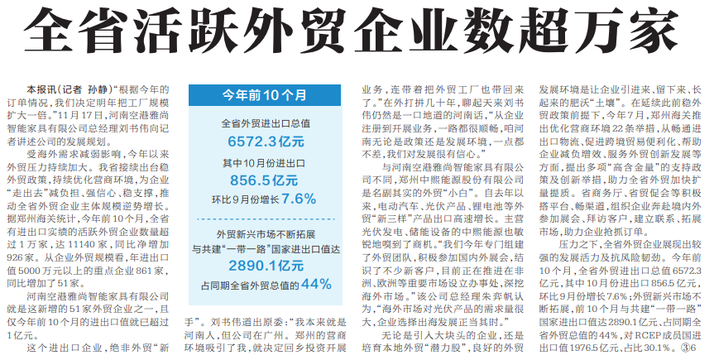 受海外需求减弱影响,今年以来外贸压力持续加大。我省接续出台稳外贸政策,持续优化营商环境,为企业“走出去”减负担、强信心、稳支撑,推动全省外贸企业主体规模逆势增长。据郑州海关统计,今年前10个月,全省有进出口实绩的活跃外贸企业数量超过1万家,达11140家,同比净增加926家。从企业外贸规模看,年进出口值5000万元以上的重点企业861家,同比增加了51家。(今日《河南日报》4版)
