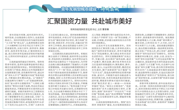 青年因城市而聚,城市因青年而兴。城市发展,企业既是核心竞争力,也是直接推动力。郑州市国资国企作为城市发展的“主力军”和“排头兵”,认真贯彻落实党的二十大精神和习近平总书记关于青年工作的重要思想,从吸引青年、培养青年、集聚青年、服务青年等方面,汇聚国资国企力量,助力郑州青年发展友好型标杆城市建设,让郑州对青年更友好,让青年在郑州更有为。(今日《郑州日报》2版)