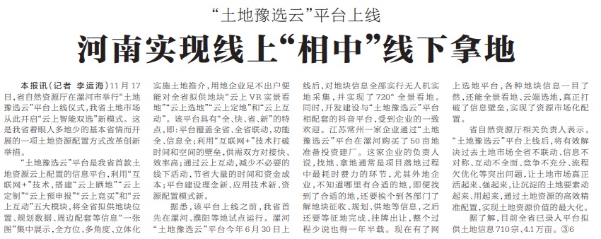 11月17日,省自然资源厅在漯河市举行“土地豫选云”平台上线仪式,我省土地市场从此开启“云上智能双选”新模式。这是我省着眼人多地少的基本省情而开展的一项土地资源配置方式改革创新举措。(今日《河南日报》2版)