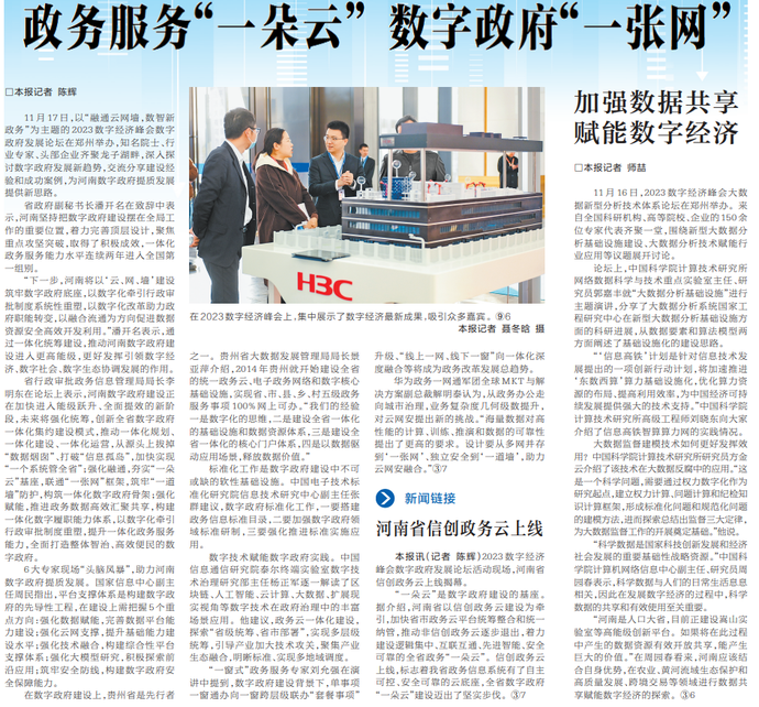 11月17日,以“融通云网墙,数智新政务”为主题的2023数字经济峰会数字政府发展论坛在郑州举办,知名院士、行业专家、头部企业齐聚龙子湖畔,深入探讨数字政府发展新趋势,交流分享建设经验和成功案例,为河南数字政府提质发展提供新思路。(今日《河南日报》5版)