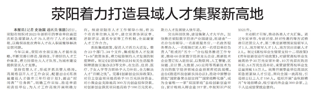 荥阳着力打造县域人才集聚新高地