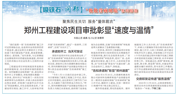 “我们是第一张‘告知承诺制’施工许可证的领取企业,也是郑州这项改革的首个受益者,通过这种方式拿到开工手续,加速了我们建设投产进度,真是更便捷、更贴心、更高效。”龙年新春,与记者聊起企业落地郑州后的建设发展速度,郑州研工光机有限公司企业负责人王炳烈兴奋地说。