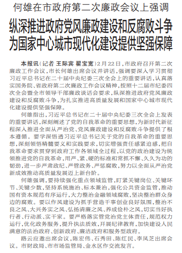 2月22日,市政府召开第二次廉政工作会议,市长何雄出席会议并讲话,强调要深入学习贯彻习近平总书记在二十届中央纪委三次全会上的重要讲话,认真落实国务院、省政府第二次廉政工作会议精神,按照十二届市纪委四次全会暨全市领导干部廉政谈话会要求,纵深推进政府党风廉政建设和反腐败斗争,为扎实推进高质量发展和国家中心城市现代化建设提供坚强保障。(今日《郑州日报》1版)