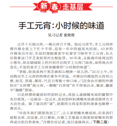 正月十五闹元宵,一碗元宵万千情。临近元宵节,手工元宵师傅丹蓉全家上下忙个不停,迎来一年中的最高光时刻。52岁的丹蓉来自开封,年幼时便跟着家中长辈学习制作手工元宵,长大后靠着这门手艺来到郑州生根发芽。30年来,从陇海市场周边的小推车,到北顺城街上的开封丹记纯手工元宵门面房,虽然地点在变化,不变的是手工元宵里藏着的“小时候的味道”。(今日《郑州日报》1版、2版)