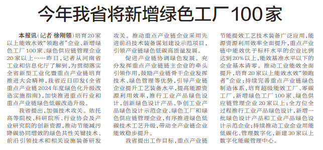 培育20家以上能效水效“领跑者”企业、新增绿色工厂100家、绿色供应链管理企业20家以上……昨日,记者从河南省工业和信息化厅了解到,为贯彻落实全省新型工业化暨重点产业链培育推进大会精神,我省近日印发《全省重点产业链2024年度绿色化升级改造实施指南》,加快推进重点行业和重点产业链绿色低碳改造升级。(今日《郑州日报》2版)