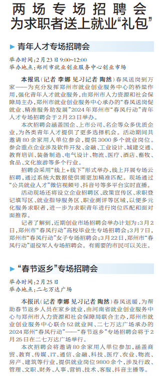 春风送暖,为帮助春节返乡人员在家乡就业,由河南省就业创业服务中心与郑州市人力资源和社会保障局联合主办,郑州市就业创业服务中心联合52就业网、二七万达广场承办的2024郑州“春风行动”——“春节返乡”专场招聘会将于2月25日在二七万达广场举行。(今日《郑州日报》2版)