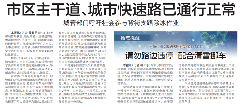2月22日,本报与郑州市城市管理局联合推出“吾爱吾城”除雪荣耀榜,呼吁党员、志愿者、企事业单位、沿街门店在做好安全防护前提下,积极参与,共同开展除雪除冰行动。