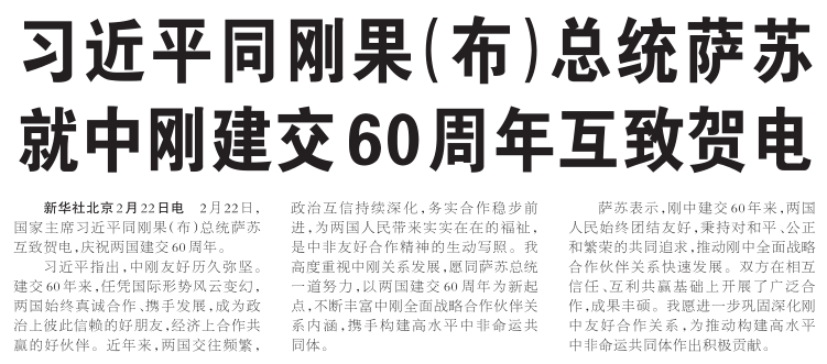 2月22日,国家主席习近平同刚果(布)总统萨苏互致贺电,庆祝两国建交60周年。(今日《人民日报》1版)