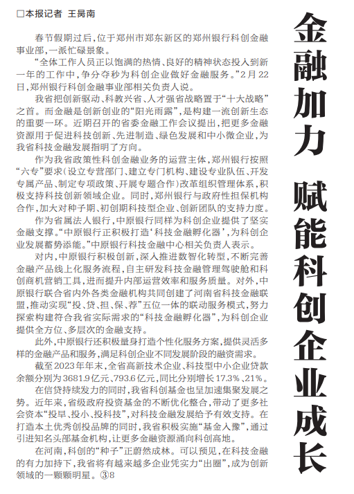 “全体工作人员正以饱满的热情、良好的精神状态投入到新一年的工作中,争分夺秒为科创企业做好金融服务。”2月22日,郑州银行科创金融事业部相关负责人说。