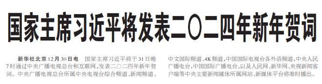 国家主席习近平将于31日晚7时通过中央广播电视总台和互联网,发表二〇二四年新年贺词。中央广播电视总台所属中央电视台综合频道、新闻频道、中文国际频道、4K频道,中国国际电视台各外语频道,中央人民广播电台,中国国际广播电台,以及人民网、新华网、央视新闻客户端等中央主要新闻媒体所属网站、新媒体平台将准时播出。(今日《人民日报》1版)