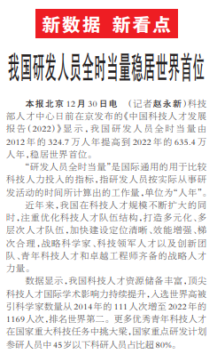 科技部人才中心日前在京发布的《中国科技人才发展报告(2022)》显示,我国研发人员全时当量由2012年的324.7万人年提高到2022年的635.4万人年,稳居世界首位。(今日《人民日报》1版)