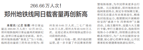 单日客运量达266.66万人次!12月29日,郑州地铁线网日客运量再次刷新纪录,创单日客运量历史新高。其中,郑州地铁线路“客流王”为1号线。线网进站量前三的车站分别为:郑州东站9.45万人次,二七广场站5.36万人次,郑州火车站4.89万人次。这是记者从郑州地铁运营分公司获得的消息。(今日《郑州日报》1版)