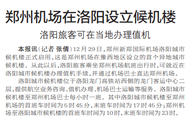12月29日,郑州新郑国际机场洛阳城市候机楼正式启用,这是郑州机场在豫西地区设立的首个异地城市候机楼。从此以后,洛阳旅客乘坐郑州机场航班出行时,可就近在洛阳城市候机楼办理值机手续,并通过机场巴士直达郑州机场。(今日《郑州日报》1版)