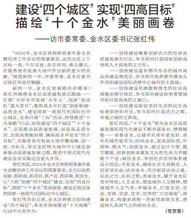 “2024年,金水区将按照省委市委全会暨经济工作会议的部署要求,动员全区上下对标一流、干在实处、走在前列、勇立潮头,在服务省市发展大局中作出新的更大的贡献。”展望新的一年,市委常委、金水区委书记张红伟直抒胸臆。(今日《郑州日报》2版)