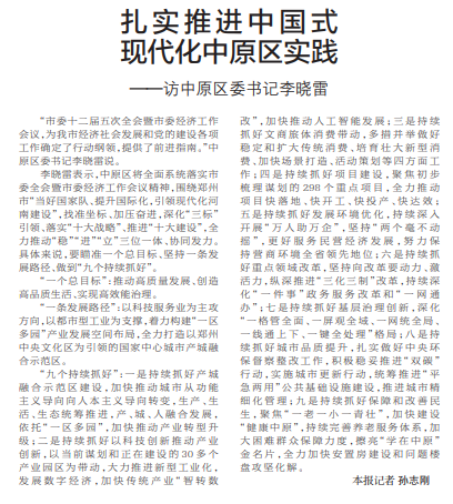 李晓雷表示,中原区将全面系统落实市委全会暨市委经济工作会议精神,围绕郑州市“当好国家队、提升国际化,引领现代化河南建设”,找准坐标、加压奋进,深化“三标”引领、落实“十大战略”、推进“十大建设”,全力推动“稳”“进”“立”三位一体、协同发力。具体来说,要瞄准一个总目标、坚持一条发展路径、做到“九个持续抓好”。(今日《郑州日报》2版)