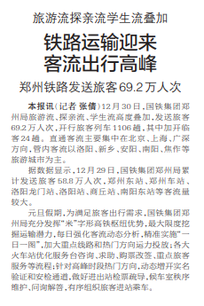 12月30日,国铁集团郑州局旅游流、探亲流、学生流高度叠加,发送旅客69.2万人次,开行旅客列车1106趟,其中加开临客24趟。直通客流主要集中在北京、上海、广深方向,管内客流以洛阳、新乡、安阳、南阳、焦作等旅游城市为主。(今日《郑州日报》2版)